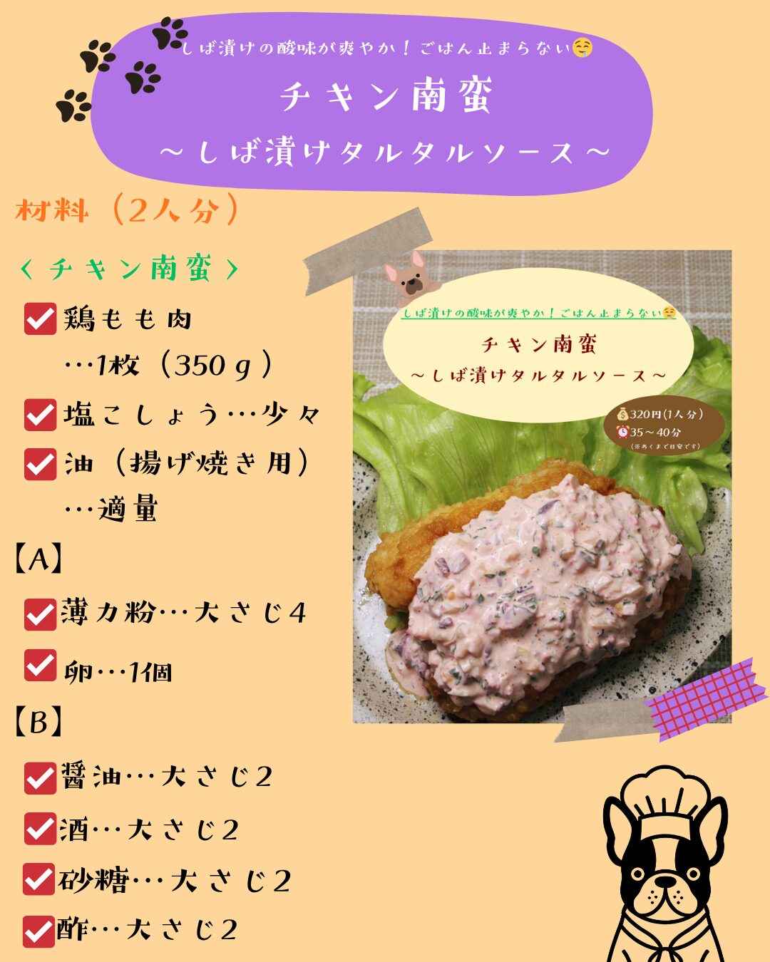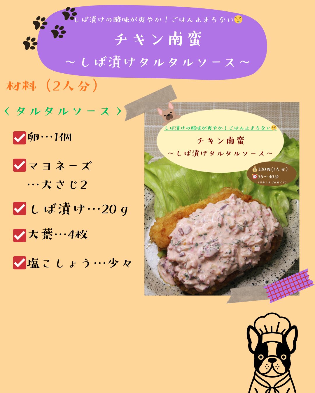 今回は、チキン南蛮~しば漬けタルタルソース~のレシピをご紹介しました。
